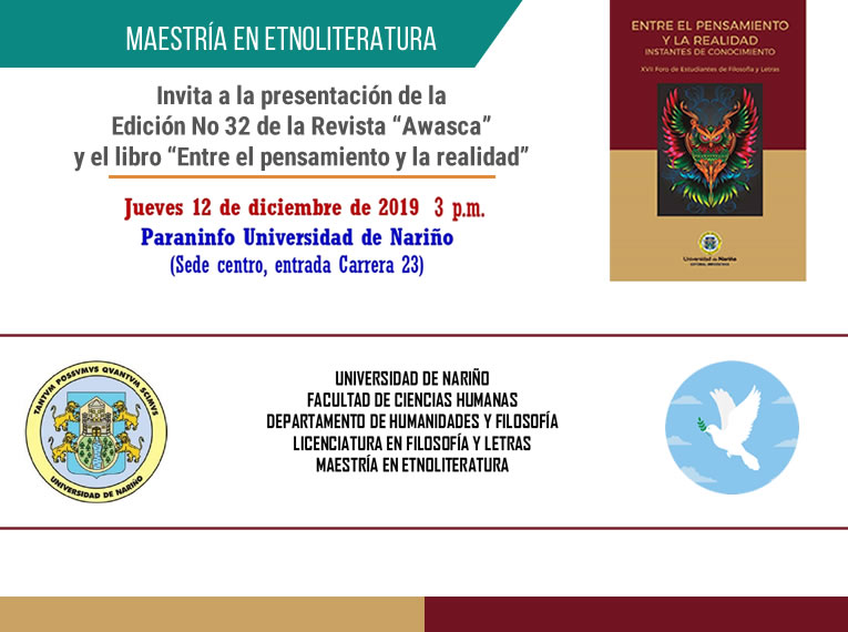 El Departamento de Humanidades y Filosofía, la Maestría en Etnoliteratura y el Taller de Escritores Awasca, invitan a la comunidad universitaria al lanzamiento de la Revista en su Número 32 año 2019