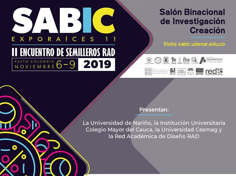 La MADIS, el Grupo de Investigación Artefacto, el Departamento de Diseño, de la Facultad de Artes, en conjunto con la Universidad Cesmag y el Colegio Mayor Del Cauca, invitan al evento científico denominado PRIMER SALÓN BINACIONAL DE INVESTIGACIÓN CREACIÓN (SABIC 2019), que se desarrollará en las instalaciones de la Universidad de Nariño