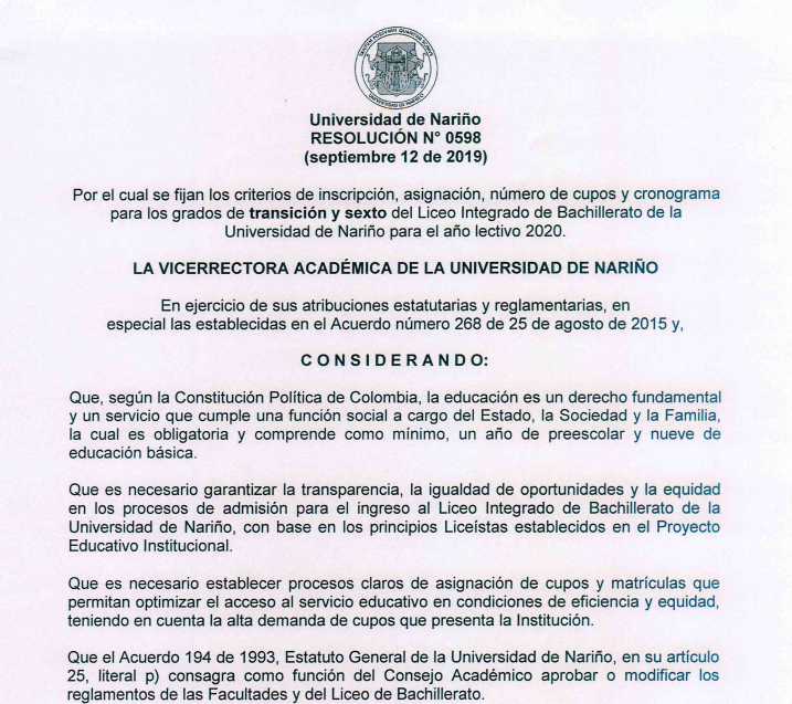 Consulte la Resolución No. 0598 del Liceo Integrado de Bachillerato 2020 por la cual se da las pautas para las inscripciones a los grados Transición y Sexto