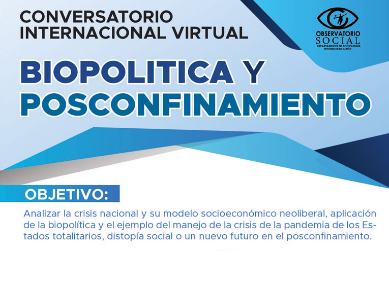 El Observatorio Social de la Facultad de Ciencias Humanas invitan a la comunidad universitaria a participar del Conversatorio internacional virtual: Biopolítica y Posconfinamiento que contará con la participación del Doctor Ricardo Oviedo Arévalo, Docente del Programa de Sociología. Este 11 de junio se desarrollará la útilma sesión con el tema “El virus desnuda la desigualdad en la educación” con el Doctor Víctor Manuel Gómez O.