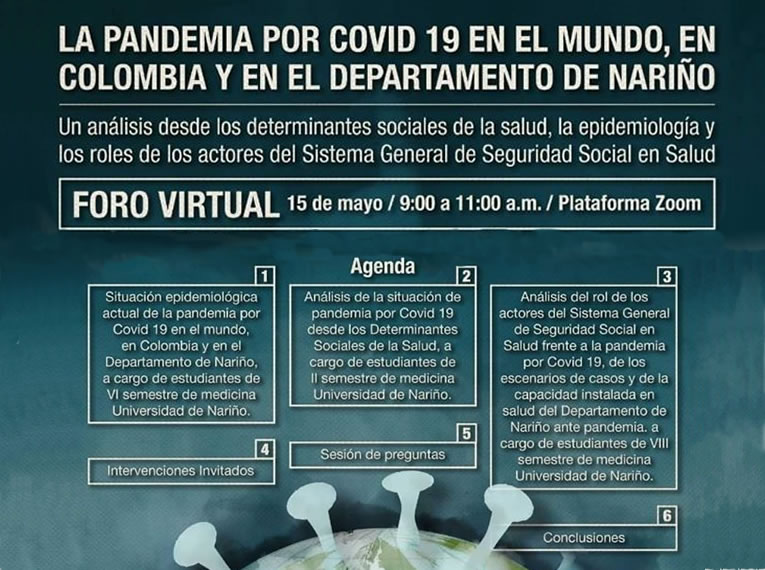 La Facultad de Ciencias de la Salud y el Programa de Medicina de la Universidad de Nariño invita a la comunidad universitaria interesada, a participar de este espacio virtual de discusión académica alrededor de la pandemia por COVID-19