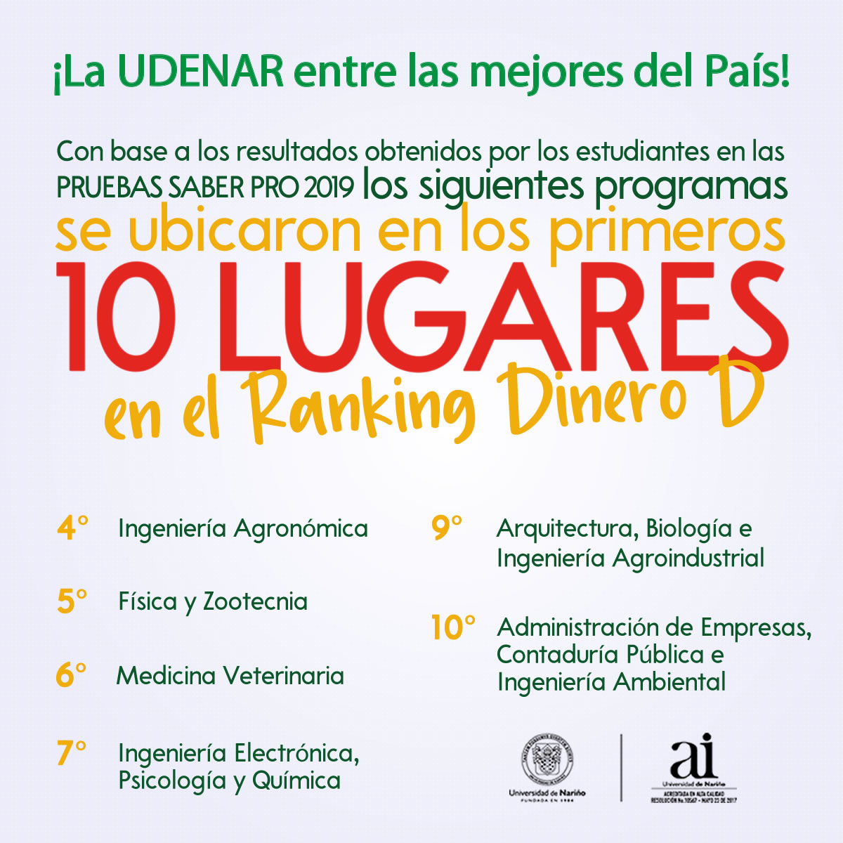 Con base los resultados obtenidos por los estudiantes que presentaron las pruebas Saber Pro en el año 2019, la Universidad de Nariño se encuentra entre las mejores del país, según el Ranking Dinero D