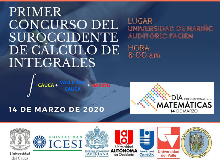 El Departamento de Matemáticas y Estadística de la Universidad de Nariño invita a los estudiantes de los diferentes programas, a participar del Primer Concurso del Suroccidente de Calculo de Integrales, que se realizará en conmemoración del Día Internacional de las Matemáticas. Inscripciones abierta en la Oficina del Departamento de Matemáticas.