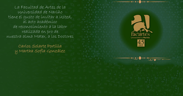 La Facultad de Artes de la Universidad de Nariño, tiene el gusto de invitar a Usted, al acto académico de reconocimiento a la labor realizada en pro de nuestra alma Mater, a los Doctores Carlos Solarte Portilla y Martha Sofía González Insuasty.