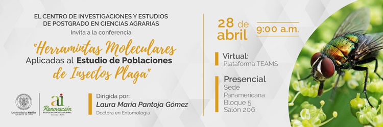 El Centro de Investigaciones y Estudios de Postgrado en Ciencias Agrarias de la Universidad de Nariño, invita a todos los interesados a participar de la conferencia “Herramientas moleculares aplicadas al estudio de poblaciones de insectos plaga dirigida por la Doctora en Entomología Laura María Pantoja Gómez.