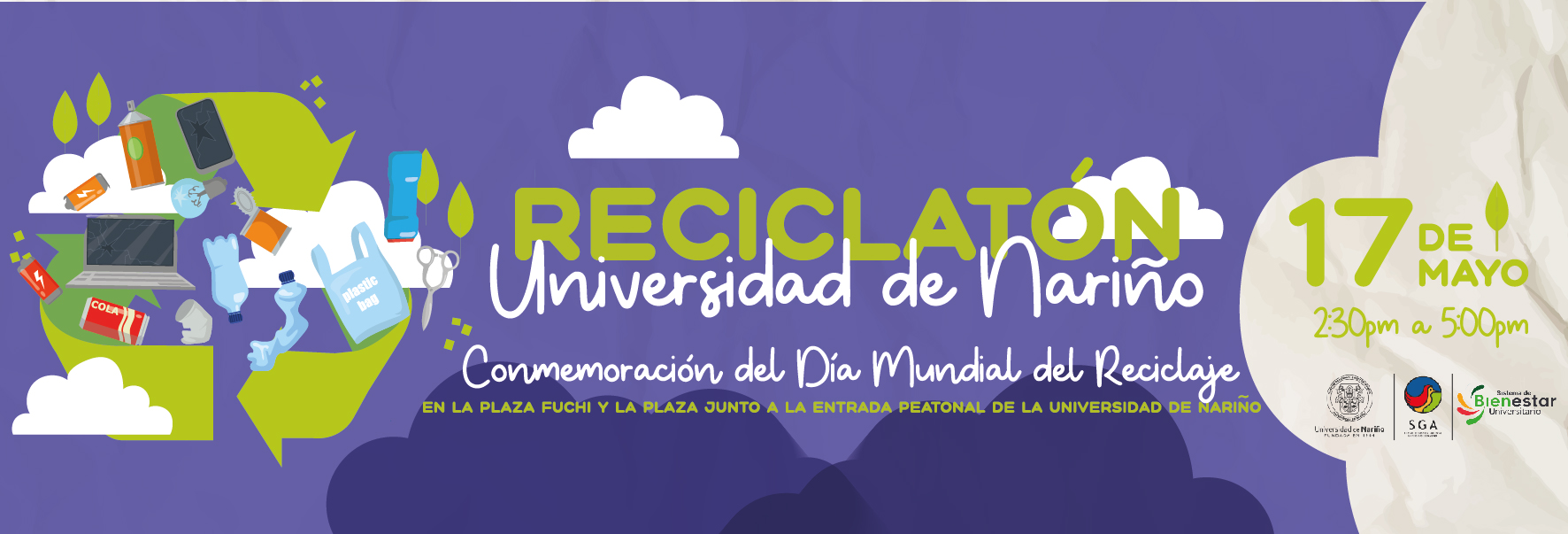 El Sistema de Bienestar Universitario y La Dirección de Planeación y Desarrollo desde el Sistema de Gestión Ambiental, tienen el honor de invitarlos a participar este 17, 20 y 21 de mayo, en La Gran Reciclatón por Pasto.