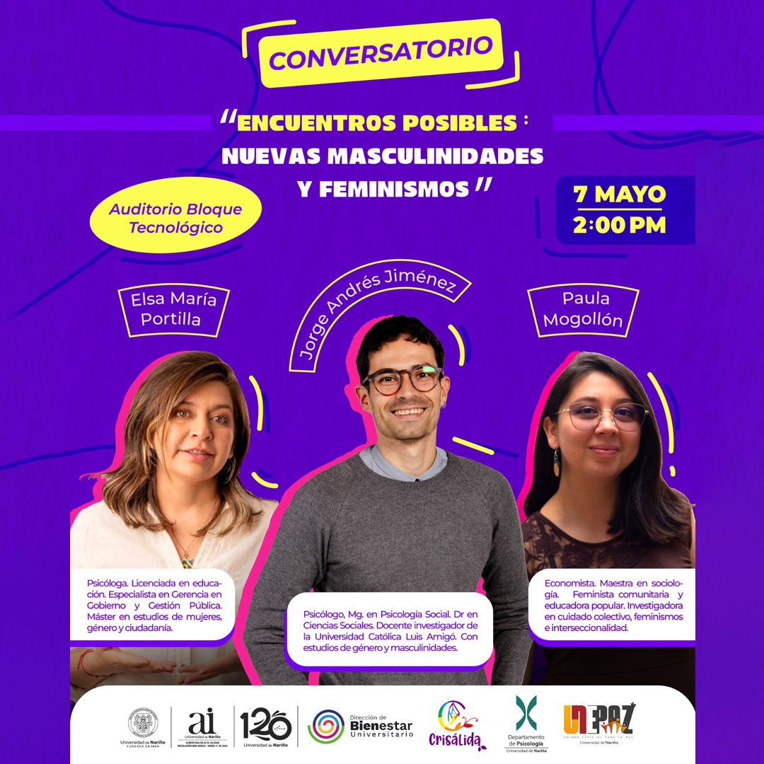 A través de la articulación entre el equipo Crisálida, UnePaz y el Programa de Psicología de la Universidad de Nariño, invitamos cordialmente al conversatorio Encuentros posibles: nuevas masculinidades y feminismos.