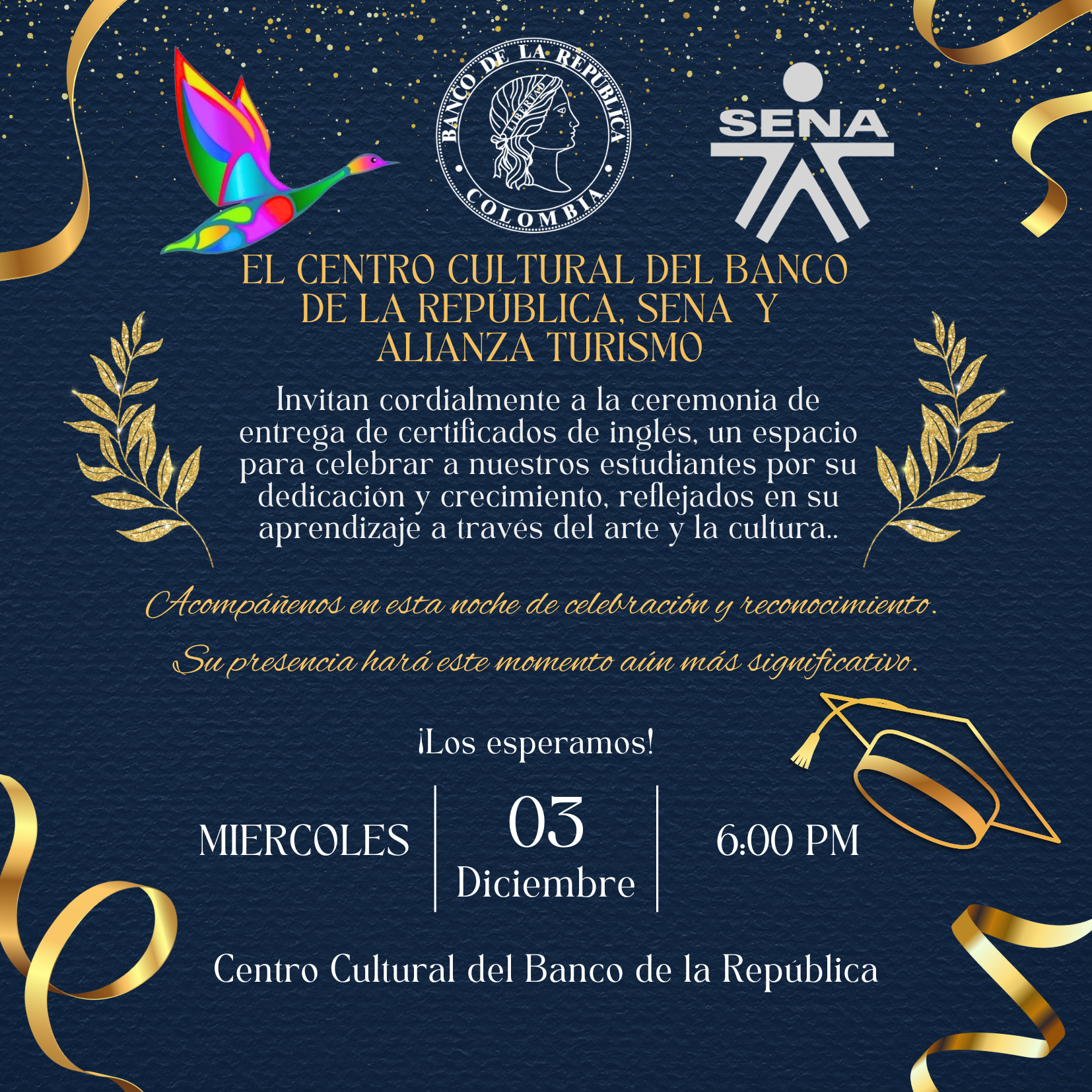 La entrega de certificados de inglés, organizada por el SENA y Alianza Turismo, tendrá lugar el miércoles 3 de diciembre a las 6:00 pm en el Centro Cultural del Banco de la República. El evento destaca el fortalecimiento del aprendizaje del inglés.