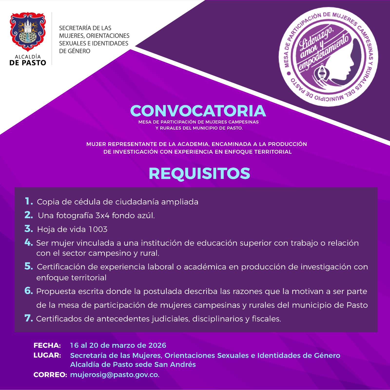 La Secretaría de las Mujeres, Orientaciones Sexuales e Identidades de Género invita a postularse a una vacante para la representación de la academia ante la Mesa de Mujeres Campesinas y Rurales del Municipio de Pasto
