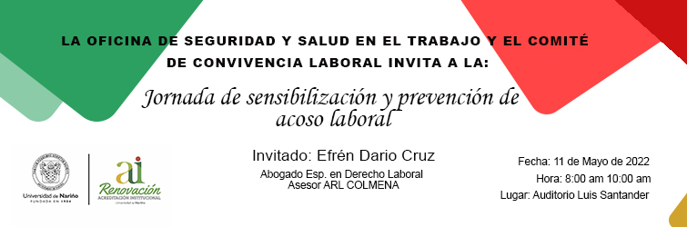 La Oficina de Seguridad y Salud en el Trabajo y el Comité de Convivencia Laboral invita a la Jornada de Sensibilización y Prevencion de Acoso Laboral el día 11 de mayo.