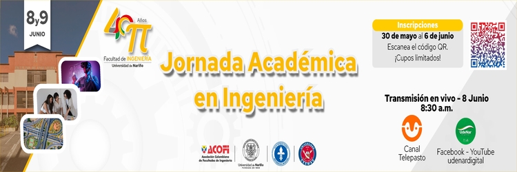 Nos complace invitar a la comunidad universitaria de la Universidad de Nariño a la Jornada Académica de Ingeniería, que se llevará a cabo los días 8 y 9 de junio. ¡Esperamos contar con su participación!