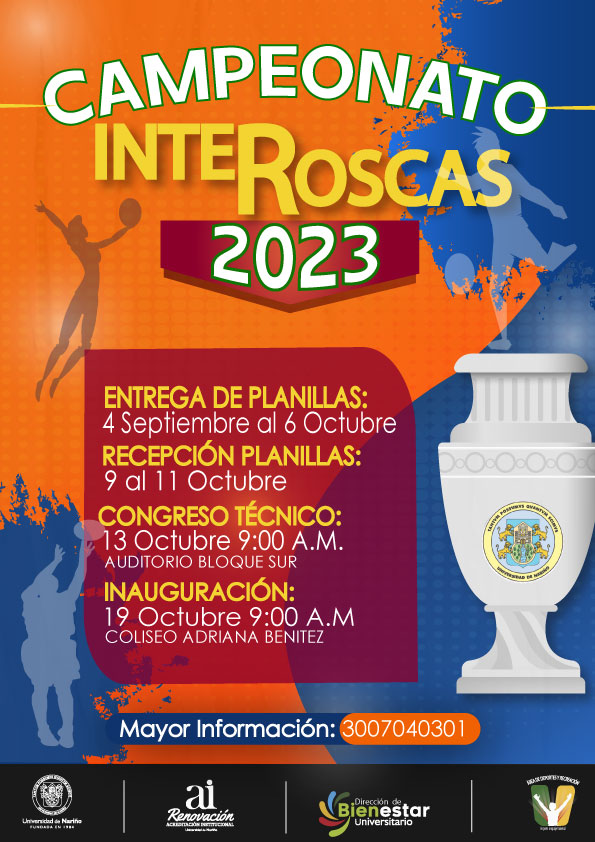 Más información Conozca más información acerca de los requisitos, fechas importantes y más CAMPEONATO INTER ROSCAS 2023 Número de vistas: 1.739 Category: Bienestar Universitario, Deportes - Eventos, Deportes - Noticias, Docentes, Estudiantes, Informativo Udenarseptiembre 14, 2023Tags: 2023inter-roscasSemestre BCompartir esta publicaciónPublicaciones RelacionadasCIRCULAR 080 de 2025 Liceo Udenardiciembre 12, 2025Resolución Número 0683 Resultados de las pruebas de conocimiento del concurso docente hora cátedra semestre A2026diciembre 11, 2025