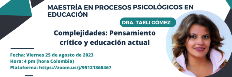 La Maestría en Procesos Psicológicos en Educación extiende una cordial invitación a participar de la Conferencia “Complejidades: Pensamiento crítico y educación actual” que desarrollará la Dra. Taeli Gómez.
