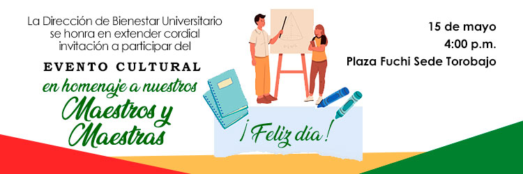 La Dirección de Bienestar Universitario de la Universidad de Nariño extiende cordial invitación a participar del “Evento cultural en homenaje a nuestro(a)s maestros y maestras” a realizarse el día 15 de mayo en la Universidad de Nariño, sede Torobajo.