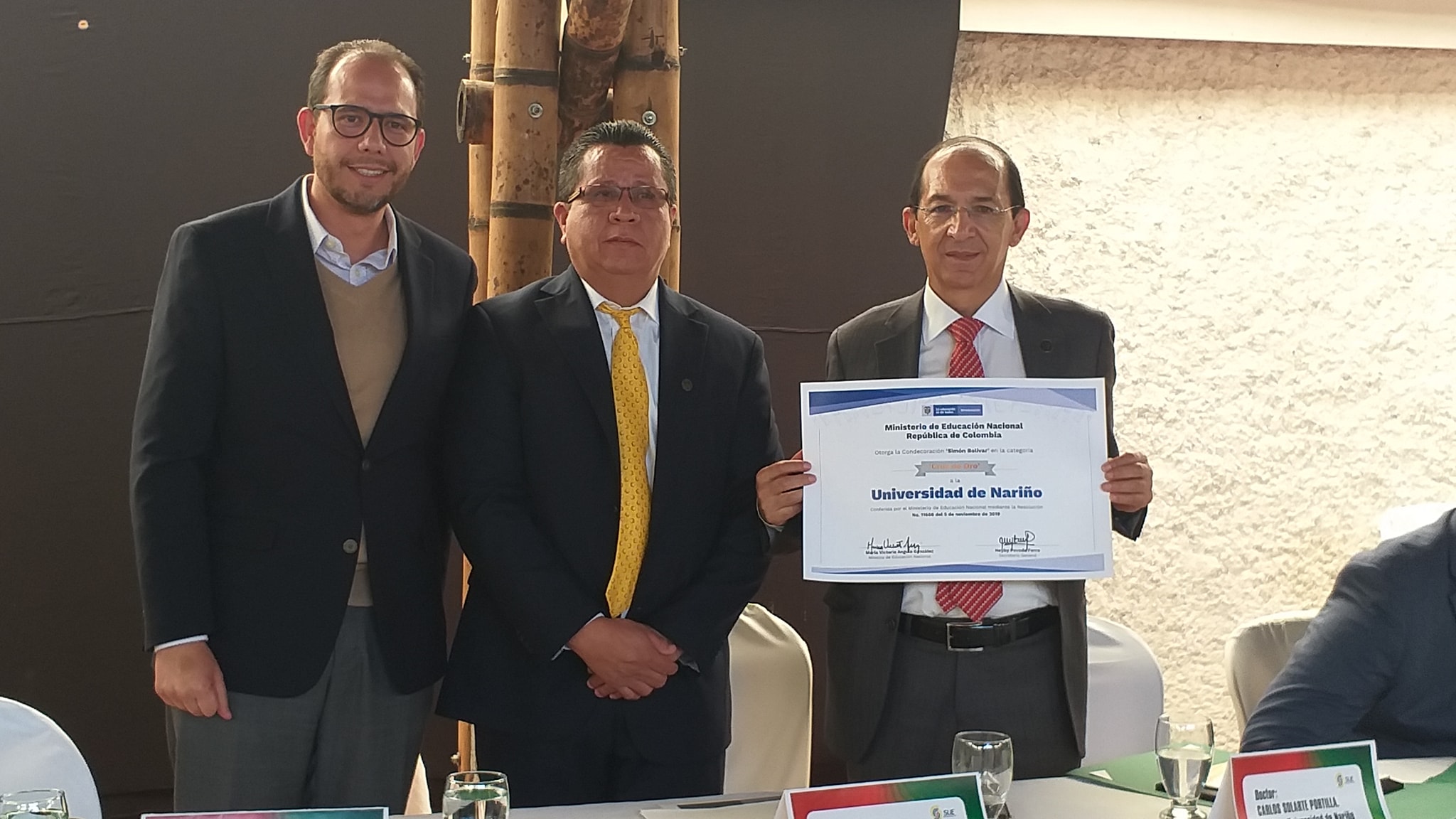 Durante la sesión del Consejo de Rectores del SUE, el Dr. Luis Fernando Pérez Pérez, Viceministro de Educación Superior hizo entrega de la Condecoración Simón Bolivar en la categoría “Cruz de Oro” a la Universidad de Nariño, conferida por el Ministerio de Educación Nacional mediante la Resolución No. N° 11666 del 5 de noviembre de 2019. El Dr. Luis Fernando destacó que: “La Universidad de Nariño es patrimonio educativo de Colombia”