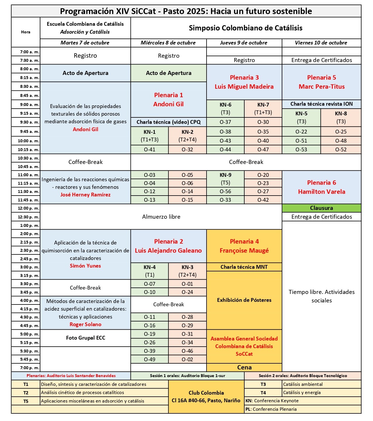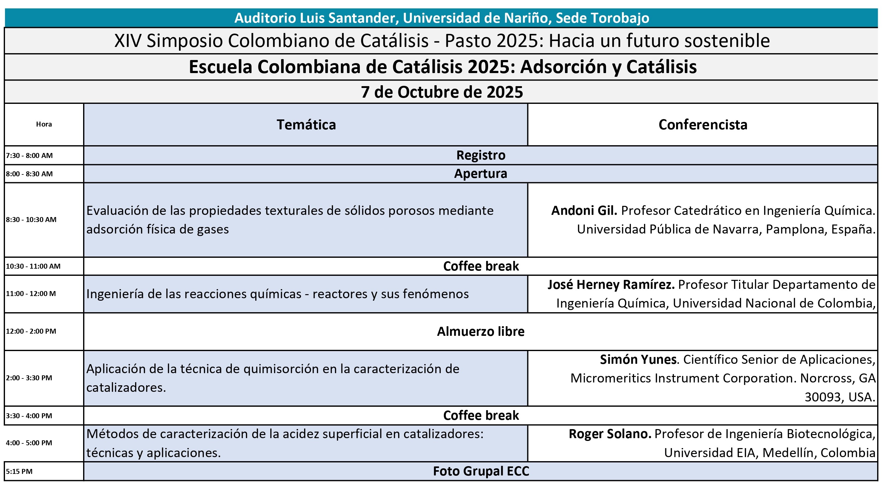 En el primer día del Simposio Colombiano de Catálisis (7 de octubre), se llevará a cabo la Escuela Colombiana de Catálisis, un espacio formativo dirigido a estudiantes, jóvenes investigadores y profesionales interesados en profundizar sus conocimientos sobre adsorción física y porosidad, adsorción química y distribución de fases activas, análisis molecular de la adsorción y los mecanismos catalíticos subyacentes. Será impartida por reconocidos expertos nacionales e internacionales, quienes compartirán sus conocimientos y experiencia en cada uno de estos campos.