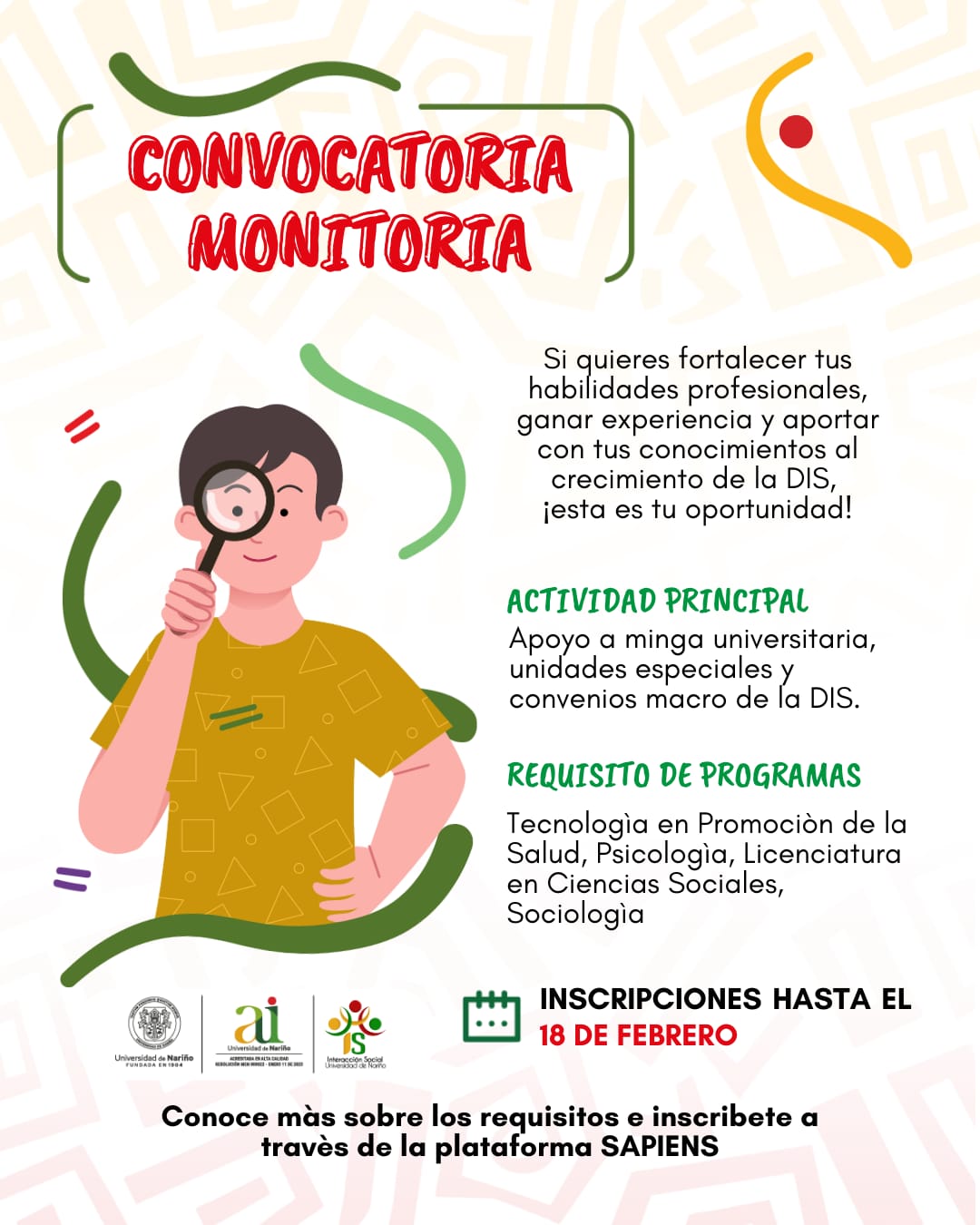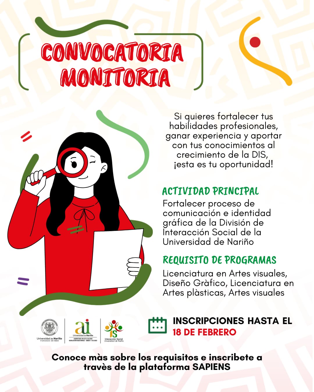 Si buscas fortalecer tus habilidades profesionales y aportar al crecimiento de la División de Interacción Social de la Universidad de Nariño, ¡esta es tu oportunidad! Participa en el apoyo a la minga universitaria, unidades especiales y convenios macro de la dependencia.
