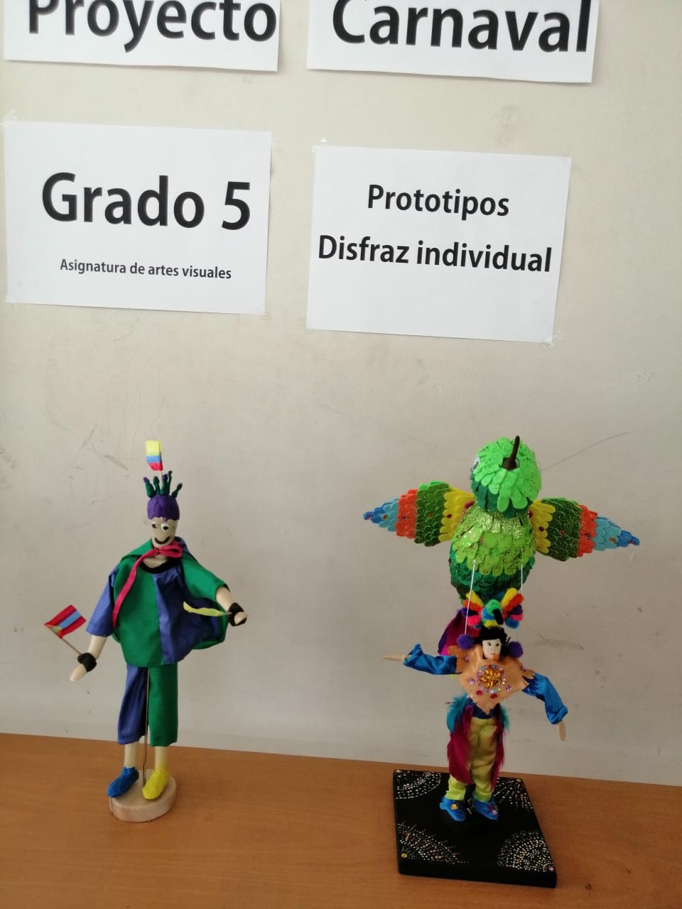 Exposición de prototipos de disfraz individual del "Proyecto Carnaval" desarrollado por los estudiantes de grado quinto. El trabajo propuesto bajo la asesoría del profesor John Mario Palacios dentro de la asignatura de artes visuales bajo la innovación de la cátedra aprendizaje basado en proyectos, el cual se cumplió el objetivo mediante procesos de trabajo colaborativo, investigación, creación y socialización del producto final.