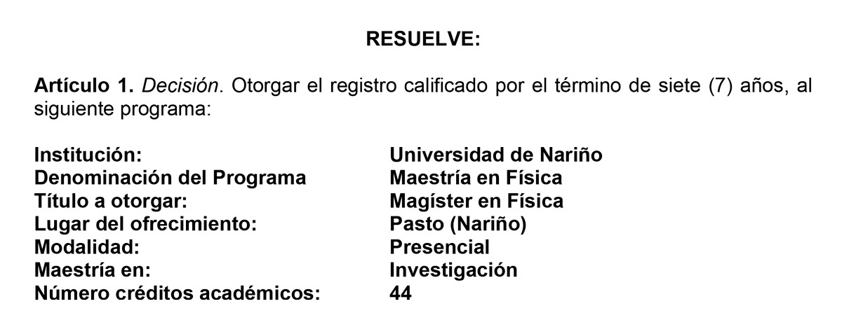 El Ministerio de Educación Nacional otorgó mediante Resolución No.017447 del 17 de septiembre de 2020, Registro Calificado por término de siete (7) años, al programa de Maestría en Física de la Universidad de Nariño, para ser ofrecido en modalidad presencial en investigación en Pasto (Nariño).