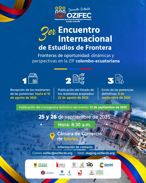 DetallesNos complace compartir con ustedes la Convocatoria al III Encuentro Internacional de Estudios de Frontera, organizado por el Observatorio de la Zona de Integración Fronteriza Ecuador – Colombia (OZIFEC) que se llevará a cabo los días 25 y 26 de septiembre de 2025