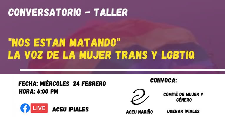 DetallesLa Universidad de Nariño Extensión Ipiales a través del Comité Estudiantil de Género, la Asociación de Estudiantes Universitarios ACEU y la Comisión de Equidad de Género y OSIG Udenar, invitan a toda la comunidad universitaria a participar del Conversatorio-Taller a las 6 pm por Facebook Live Aceu Ipiales