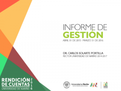 El presente documento “Informe de Gestión Abril 2013 – Marzo 2014” comprende el detalle-síntesis de las actividades realizadas en la Universidad de Nariño, desde la Administración Central y en el devenir y compromiso de las Facultades y Programas, en consonancia con lo estipulado en el “Plan de Desarrollo de la Universidad de Nariño, 2008-2020. Pensar la Universidad y la Región”, las políticas educativas de cada Unidad, en el campo de lo académico, lo investigativo, la proyección social, aquellos lineamientos teórico-prácticos facilitadores de la gestión universitaria en general y la Propuesta Rectoral de Trabajo 2011 – 2014 “La Universidad es Ahora. Proyectémosla Nacional e Internacionalmente”.