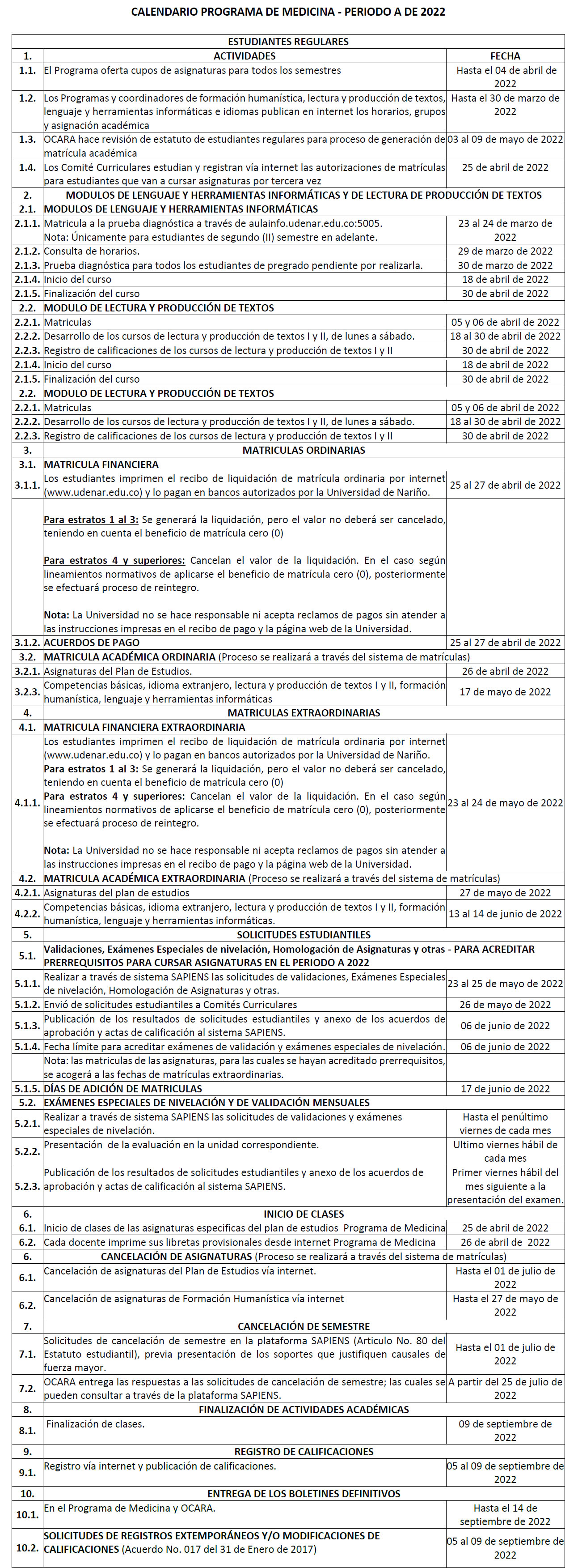 Aprobar el calendario académico, periodo A de 2022, únicamente para el Programa de Medicina, de la siguiente manera: