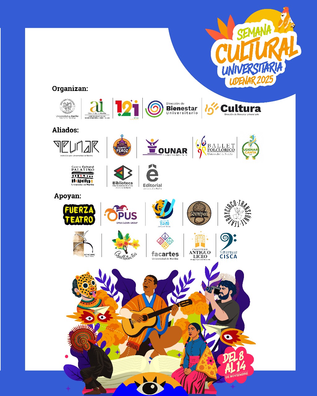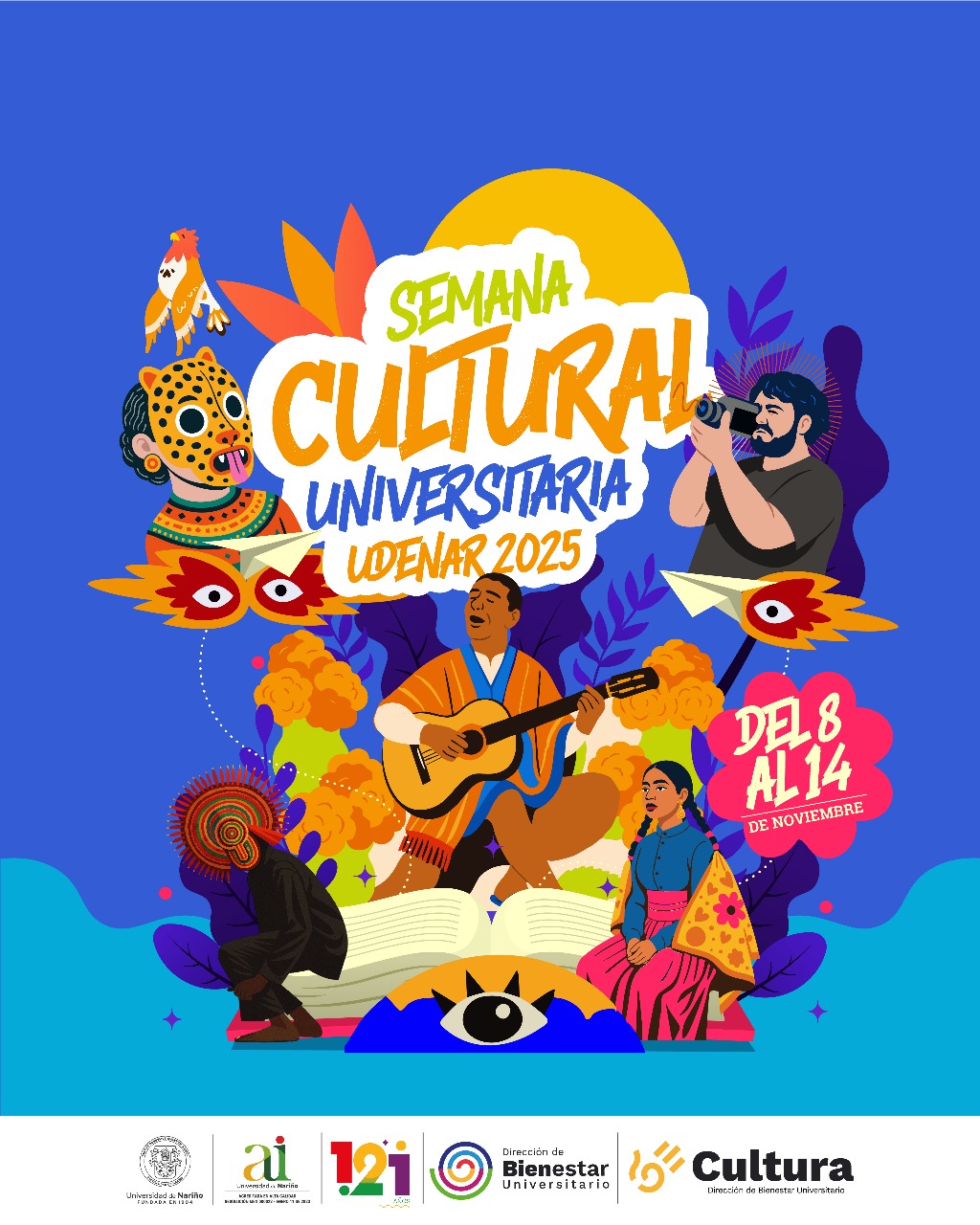 Del 8 al 14 de noviembre, vive la Semana Cultural Universitaria UDENAR 2025, un encuentro lleno de arte, danza, teatro, oralidad, audiovisual, música y literatura.